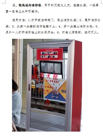 包括:消防泵房;地铁出入口及逃生方向指示;禁止吸烟和请勿扔杂物的标识还有消防电话插孔;轻轨消防逃生绳和照明灯;轻轨车厢紧急解锁;轻轨车厢紧急报警器;火警电话;地铁车厢紧急出口标识;地铁禁止携带物品目录;地铁严禁携带易燃易爆物品危险进站标识;消防升降梯;地铁紧急停车按钮 ;地铁安检;消防阀门;火灾声光报警器。