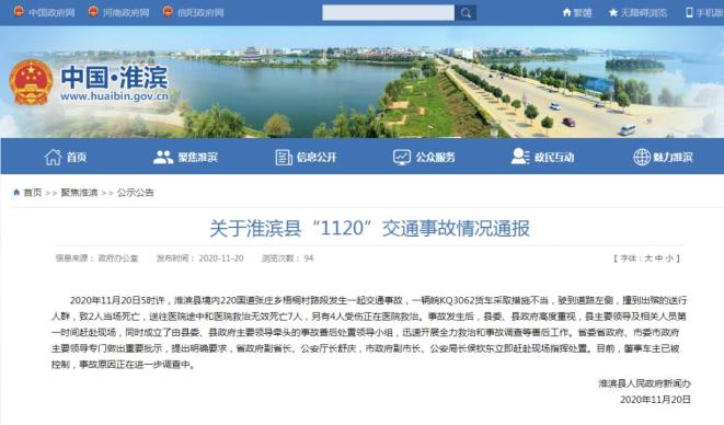 今天(20日)11时许,河南信阳淮滨县人民政府新闻办发布《关于淮滨县“1120”交通事故情况通报》。