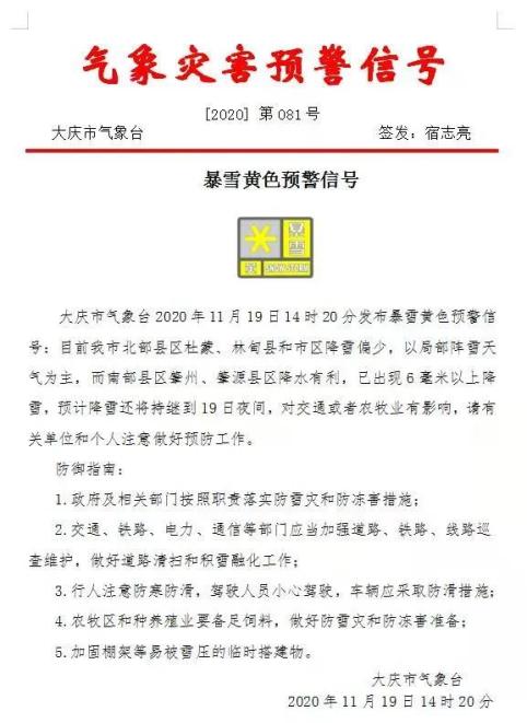 【肇源县气象局】肇源县气象台2020年11月19日11时14分更新发布暴雪黄色预警信号:目前我县降雪量已经达到6.2mm且仍将持续,可能对交通或者农牧业有影响,请有关单位和个人注意做好预防工作。肇源县(市民提供视频)