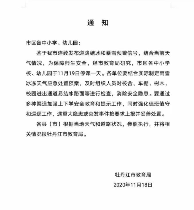 根据气象部门信息发布,我市暴雪灾害预警等级已达到红色预警。经请示市政府同意,11月19日全市中小学、幼儿园停课一天。受降雪影响较小的区县(市)是否停课,由当地政府根据实际情况自行决定。目前已到校的学生学校要做好看护工作,家长方便时来接,未到校的学生可以采取在线学习等形式在家自学。记者获悉,牡丹江、双城、宾县、延寿等地18日晚已提前发布停课通知。