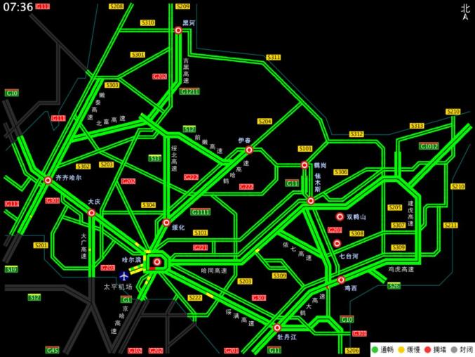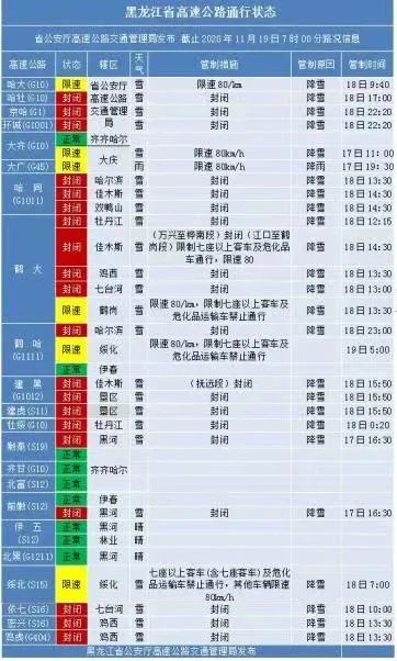 哈尔滨绕城高速、京哈高速、哈同高速、哈牡高速、依七高速、鸡虎高速、牡绥高速、牡复高速、密兴高速、建虎高速、建黑高速、哈伊高速赵家站至兴隆站、鹤大高速万兴站至铁岭河站封闭;哈伊高速绥化站至庆安站、绥北高速绥化西站至海北站,禁止七座以上客车(含七座)及危化品运输车辆通行;鹤佳高速禁止七座以上客车及危化品运输车辆通行。省内其它高速均路况正常。