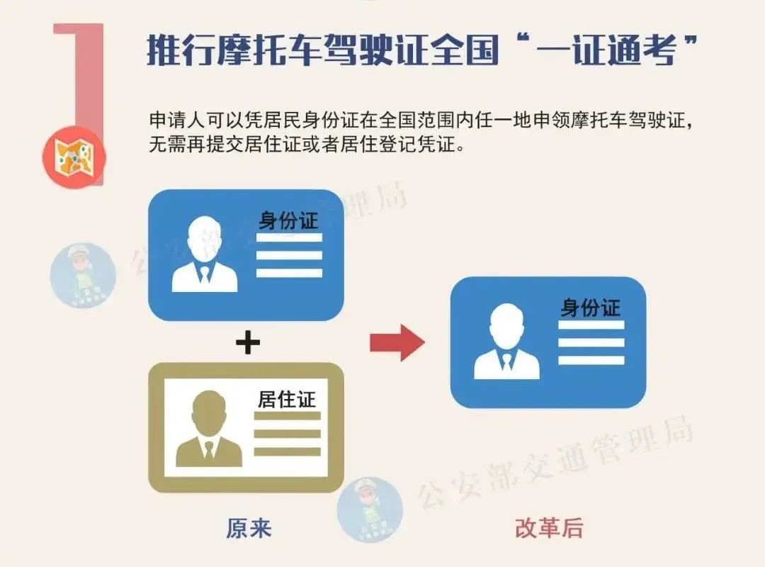 在实现小型汽车驾驶证“全国通考”的基础上,推行摩托车驾驶证全国“一证通考”,申请人可以凭居民身份证在全国范围内任一地申领摩托车驾驶证,无需再提交居住证或者居住登记凭证。