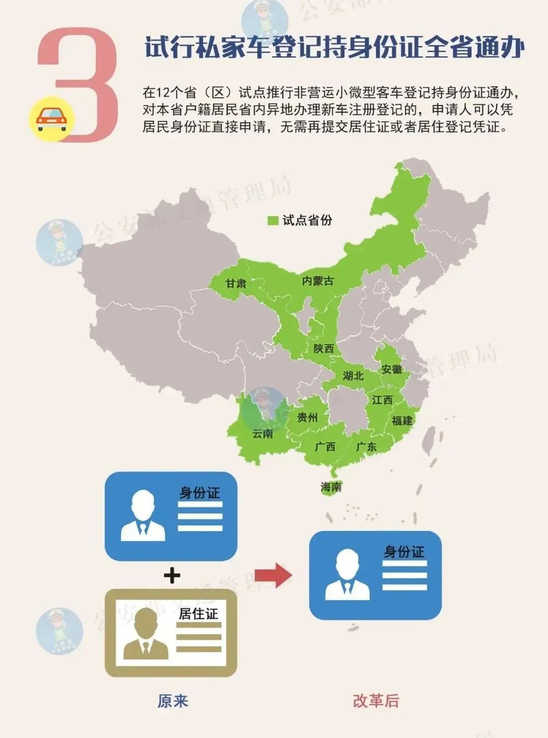 在12个省(区)试点推行非营运小微型客车登记持身份证通办,对本省户籍居民省内异地办理新车注册登记的,申请人可以凭居民身份证直接申请,无需再提交居住证或者居住登记凭证。