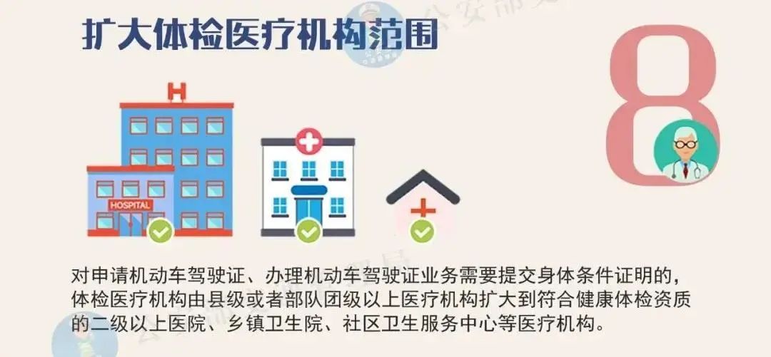 对申请机动车驾驶证需要提交身体条件证明的,体检医疗机构由县级或者部队团级以上医疗机构扩大到符合健康体检资质的二级以上医院、乡镇卫生院、社区卫生服务中心、健康体检中心等医疗机构。