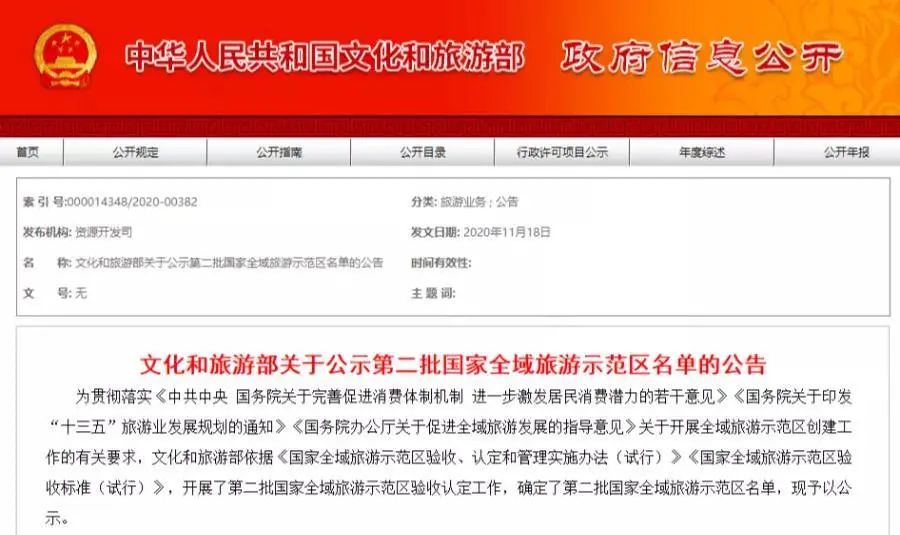 11月18日,文化和旅游部公示第二批国家全域旅游示范区名单,包括秦皇岛市山海关区在内的97个创建单位入选。
