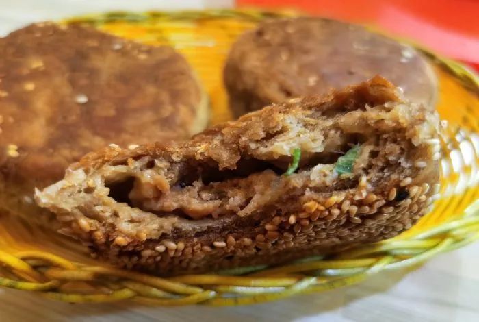 他家的烧饼分为素烧饼和肉烧饼