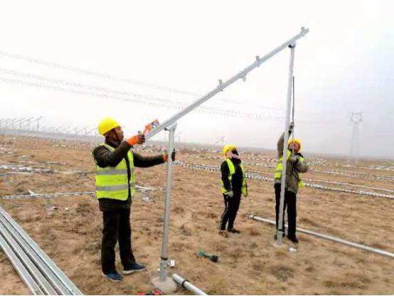 与此同时,在利通区中核200MW光伏复合发电项目建设工地,已经架设好的光伏组件,在阳光下熠熠生辉。在未架设好的工地上,数百工人来回穿梭在钢架间,将光伏组件调装到钢架上。