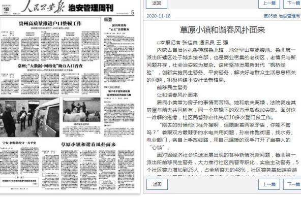 坚持“以人民为中心”,通辽市公安机关大力传承和发扬草原“枫桥经验”,结出累累硕果。近日《人民公安报》对通辽市扎鲁特旗公安局鲁北第一派出所的先进做法进行宣传报道。