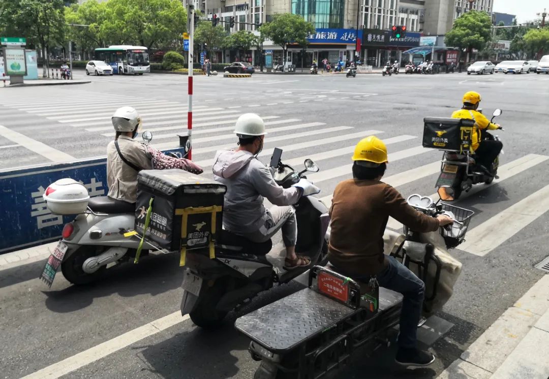 骑着电动车在车流中穿插、逆行