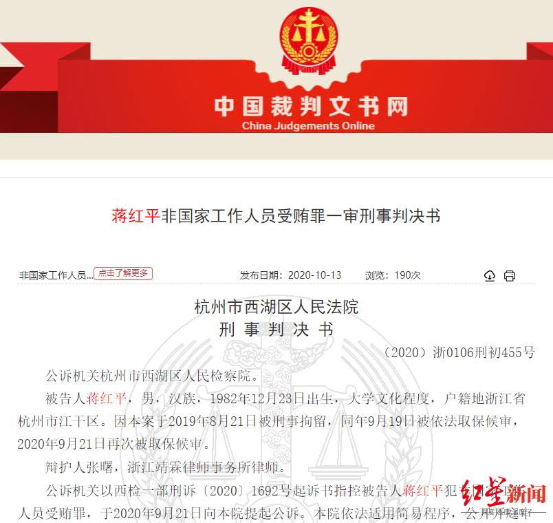 2020年9月29日,浙江菜鸟供应链管理有限公司(后简称菜鸟公司)业务拓展专家蒋红平被判刑。