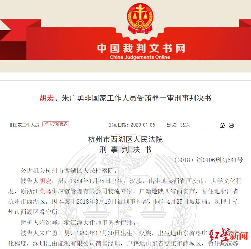 2018年8月24日,菜鸟公司物流专家胡宏受贿被判刑。