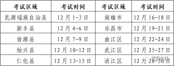 考试时间统一安排在12月1日至12月30日(不另设补考时间),考试区域按单位所在地划分。