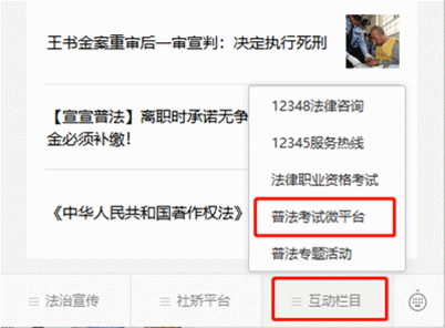 五、考试方式通过“韶司在线”微信公众号(微信号:gdsgsfj)——“韶关市普法考试微平台”进行考试,具体步骤:“韶司在线”微信公众号→互动栏目→普法考试微平台→考试中心→2020年韶关市国家工作人员年度学法考试试题→完成考试后提交。