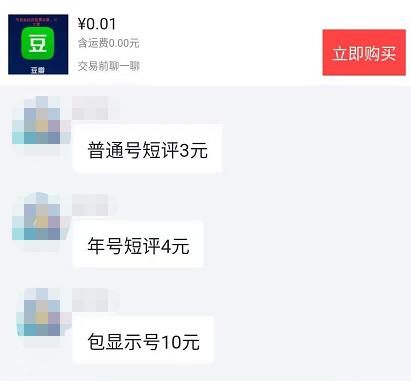 在闲鱼等交易平台上,有很多卖家发布“豆瓣代发帖控评投票点赞”服务,并且都表示,可以接“大量”的单,其中一位卖家介绍,账号是分等级收费的,普通账号短评3元/条,注册满一年的账号短评4元/条,如果想被显示出来,每条评论的价格则要高达10元。
