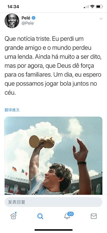巴西球星贝利在其社交媒体账号发文对马拉多纳去世表示哀悼,他说,希望有一天能在天堂和马拉多纳一起踢球。