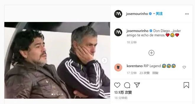名帅穆里尼奥表达了对马拉多纳的哀悼。“想念你,迭戈,我的老朋友。”