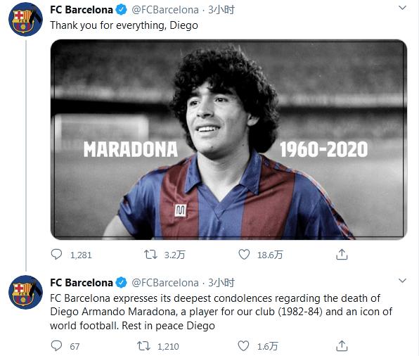 巴塞罗那足球俱乐部发文“感谢他所做的一切”,称“对马拉多纳的逝世表示最深切的哀悼,他是我们俱乐部的球员(1982-84),也是世界足球的象征。安息吧,迭戈。”