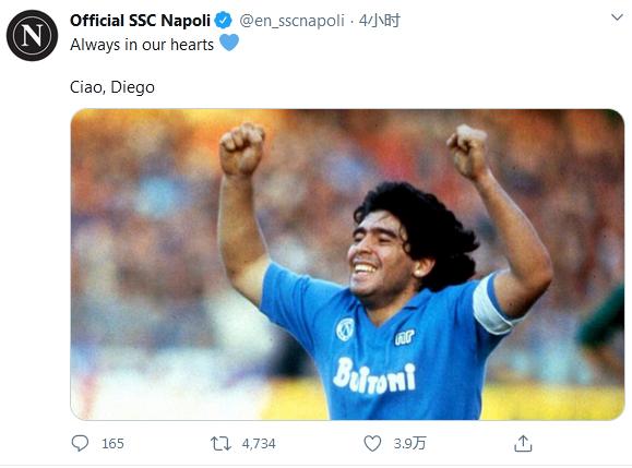 而意大利那不勒斯足球俱乐部则将官推标志改为黑白色以此缅怀马拉多纳,并发推称,“永远在我们心中!再见,迭戈”