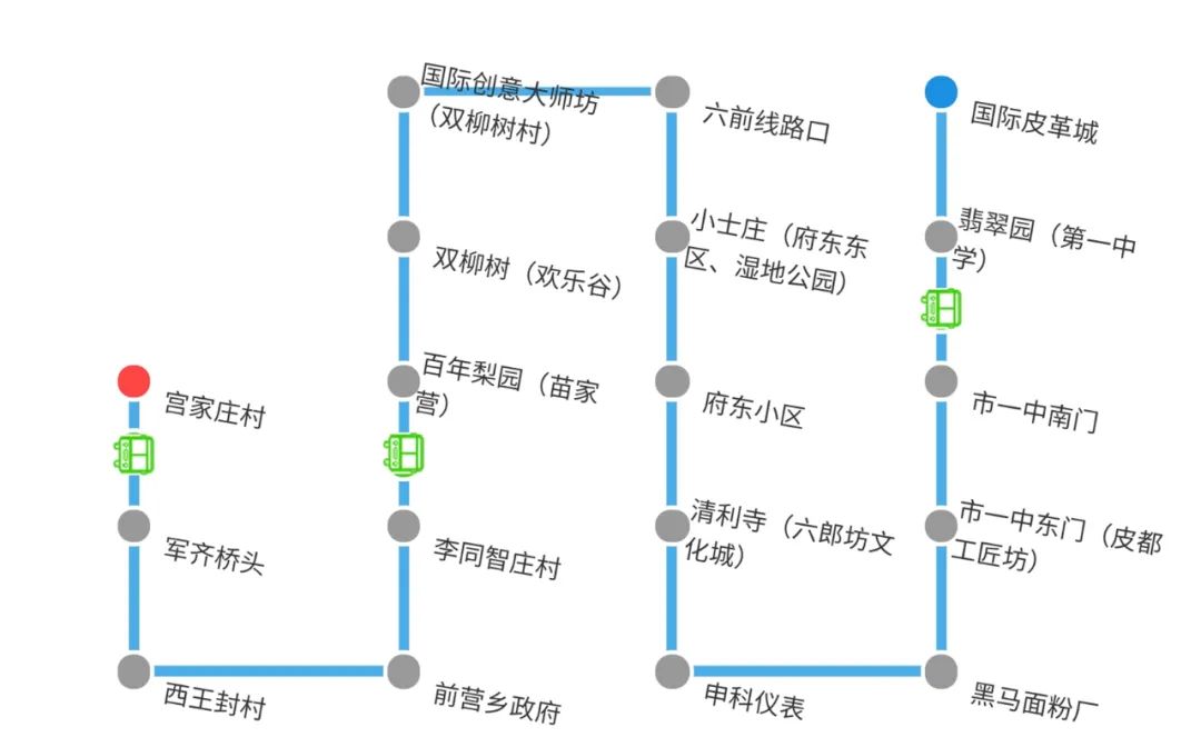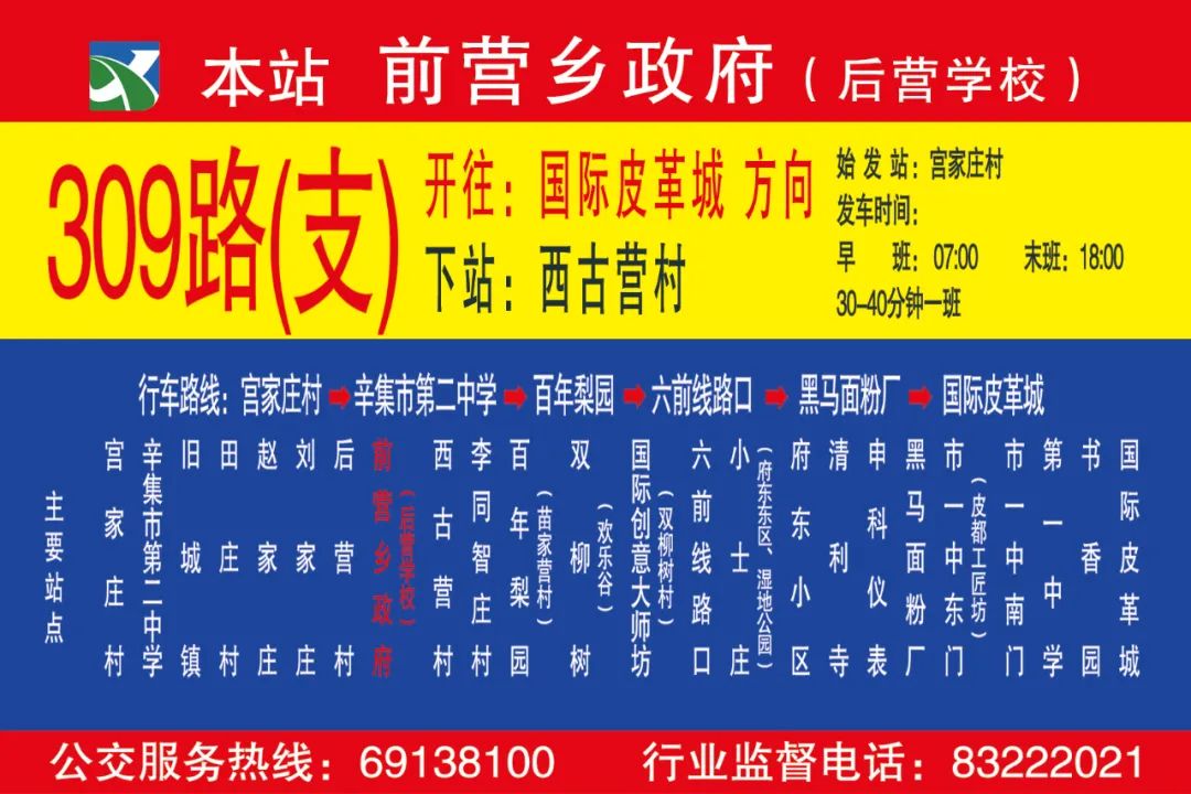 11月27日早上7点,第一班309(支)路城乡公交从国际皮革城始发与309主线相比,309(支)路城乡公交线路新增前营乡政府、后营村、刘家庄、赵家庄、田庄村、云大集、旧城镇、辛集市第二中学8个站点,线路单边里程28公里,双向共计51个站点,单程运行时间65分钟,运行时间7:00-18:00,双向对开,发车间隔30-40分钟一班。