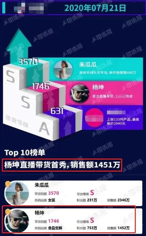 11月25日晚,据财经报道称,杨坤在上半年的直播带货榜单中,首秀便创下1451万元的销售额,排行榜单第二名的好成绩。