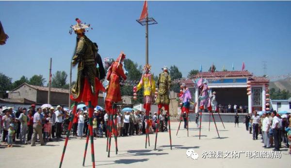在清康熙年间,是因康熙皇帝喜得孙子,减免了三年的税,老百姓高兴就开始了隆重的社火表演。高跷是社火中的重头戏,源于古代巫术,是与天神相接近的一种传神活动。由青年男子踩,跷腿高2米到3米,以戏剧中的本戏为主,演出时有三十幅跷子同时巡街表演,没有像苦水高高跷的扶杆,行动自如洒脱。演出时以《隋唐演义》、《三国演义》、《封神榜》、《五典坡》等历史戏剧为主,在表演中即有巡街行走表演,也有广场表演。广场表演中有穿插、套四门、拉圆场、圈心、走二龙戏珠等,以八卦、太极图为表演形式,突出道教文化色彩。表演半个多小时,配以音乐,乐曲有戏剧唱腔、锣鼓。踩锣鼓点子行走、表演。跷子所到之处有群众跪下让高跷跨过,以祈吉祥。跷子特别之处一是高,高可达3米;二是跷腿用漆涂成绿色、红色的几段落,色彩绚丽,与传统戏服相映衬;三是民间传说丰富;四是到村上各庙宇去表演,有燎火、上香等民俗活动;五是在旧社会都要到连城鲁土司衙门表演;六是没有象苦水高高跷那样的扶杆,给人自然表演的惊奇感。