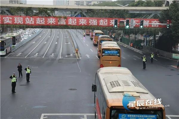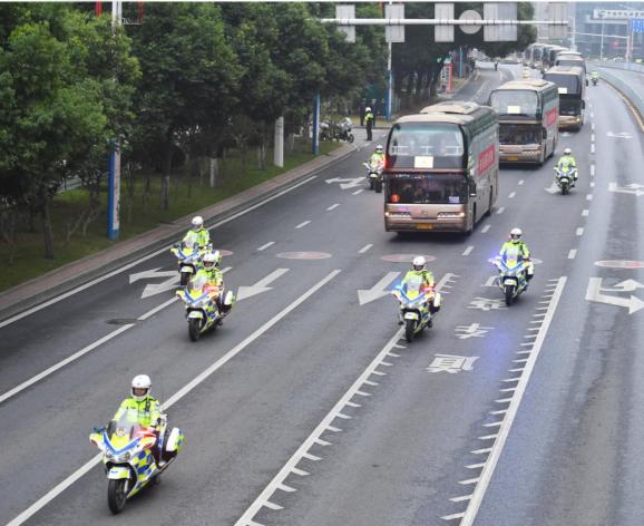 警车开道、骑警护行,英雄们一路前往湖南人民会堂。他们乘坐的车队所经之处,交警纷纷敬礼,群众驻足注目。