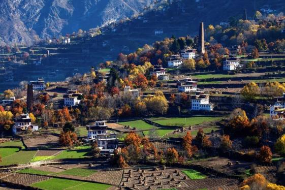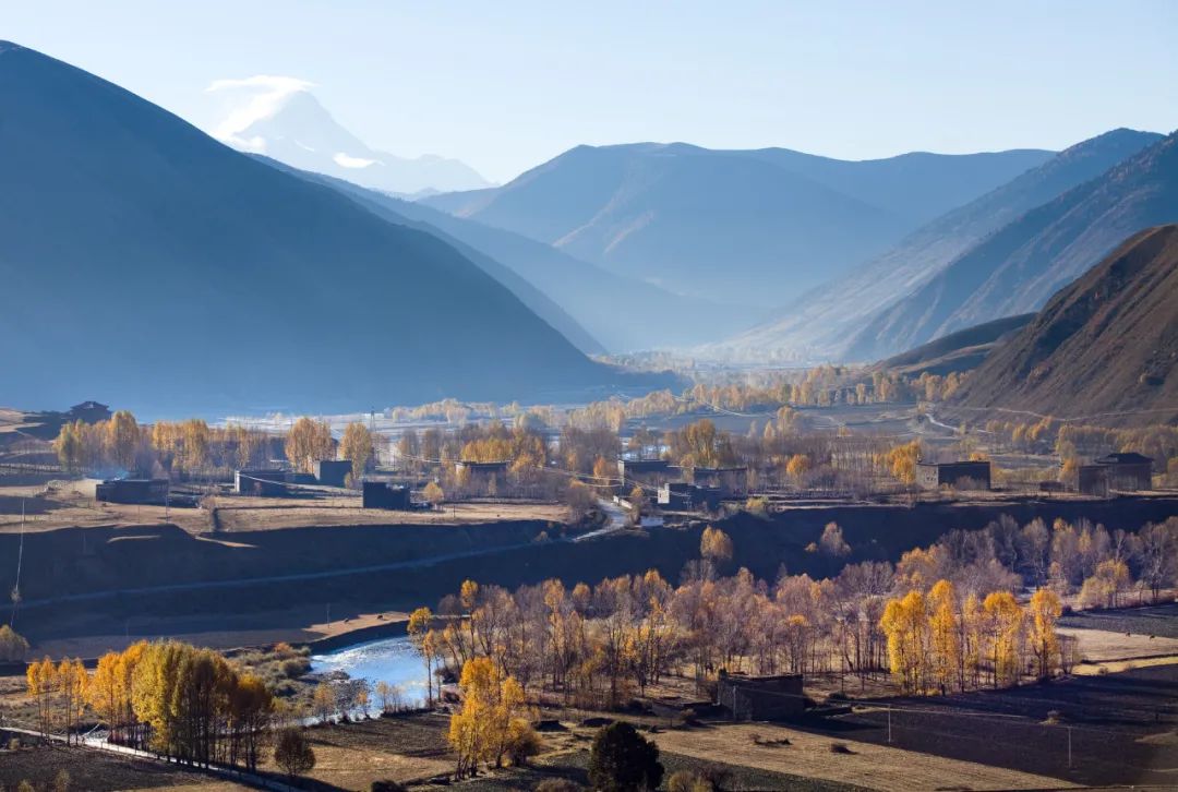 在丹巴,甲居藏寨的楼房沿着大金河谷层层而上,依托着山势绵延起伏,一直延伸至卡帕马群峰脚下,如同一幅汇集了雪山、河谷、溪流、人家的水墨画卷。