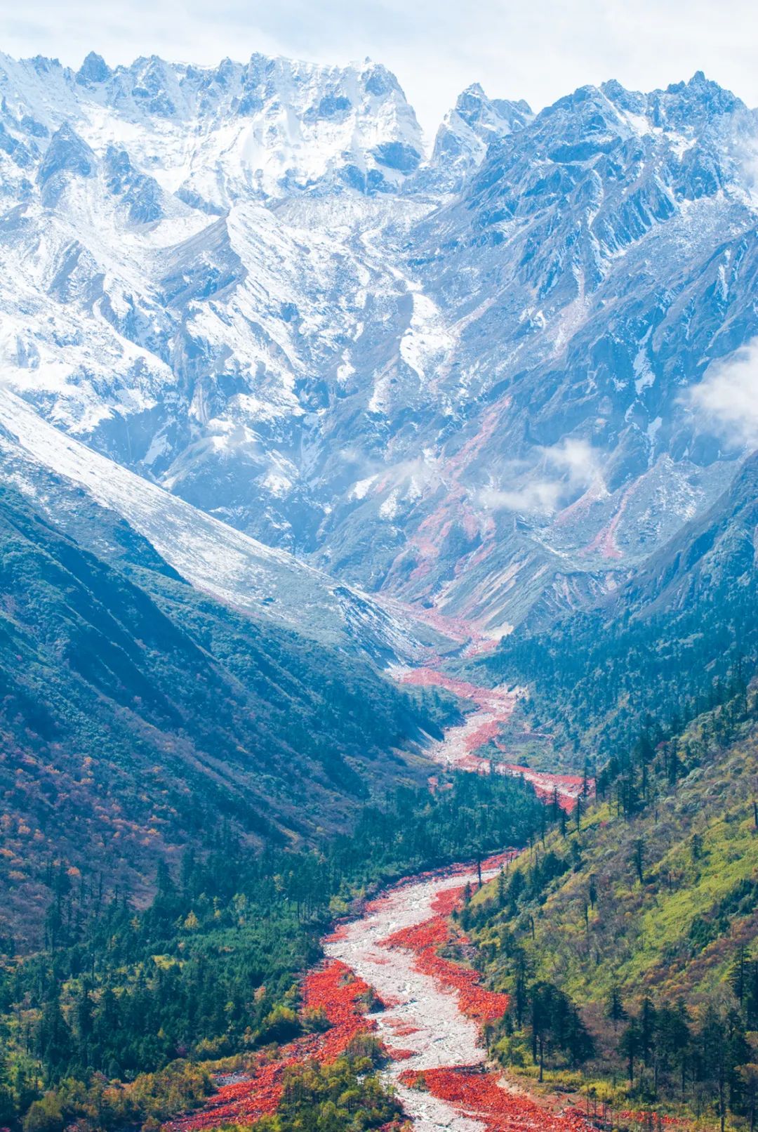 在这段距离中,由于海拔的急剧升高,气温也随之下降。在降水丰沛的贡嘎山区,厚重的积雪被挤压成晶莹冰川,贡嘎主峰周围的冰川多达74条,呈羽毛状向下扩散,像为“蜀山之王”披上了一层洁白的纱衣。