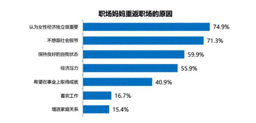 据《2019年职场妈妈生存状况调查报告》显示,“认为女性保持经济独立很重要”和“不想跟社会脱节”成为职场妈妈重返职场的重要原因,其次,“保持良好的自我状态”和迫于“经济压力”也是促使职场妈妈生育后返回职场的重要原因。即便生娃占据了女性更多的精力和时间,但妈妈们对自己还是有着更高的要求。