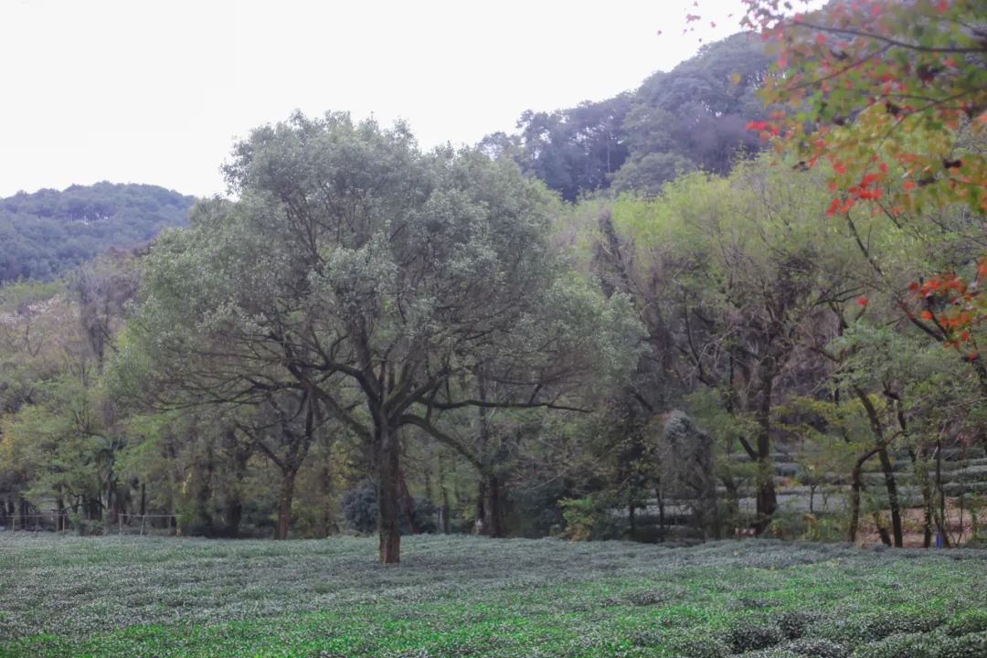 再往上走,红枫之外又多了一层浓烈的绿色,除了枫叶出名、秋景撩人以外,九溪还是很有名的龙井产地。