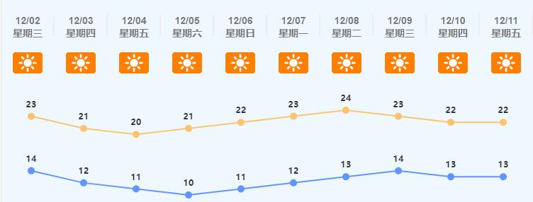 未来两天,有弱冷空气南下补充影响,我市气温小幅度下降,北风加大,昼夜温差大,晴燥天气持续。12月5日最低气温降至10℃