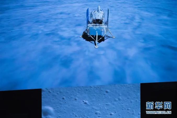 期间,探测器进行快速姿态调整,逐渐接近月表;此后进行障碍自动检测,选定着陆点后,开始避障下降和缓速垂直下降,平稳着陆在位于月球正面风暴洋的吕姆克山脉以北地区。着陆过程中,着陆器配置的降落相机拍摄了着陆区域影像图。