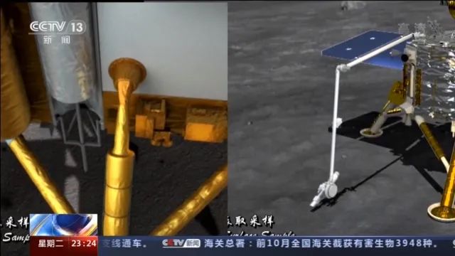 航天科技集团五院 嫦娥五号探测器主任设计师 姜水清:从全球来讲,它表取也是全球首次月面无人自主采样一个任务。为了实现这个任务,我们实际上是设计了三个产品,有个四自由度采样机械臂,然后末端又带了两种采样器,一种是可以实现铲挖,一种是可以实现浅钻,来实现不同类型月壤的采集。