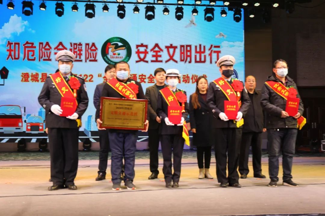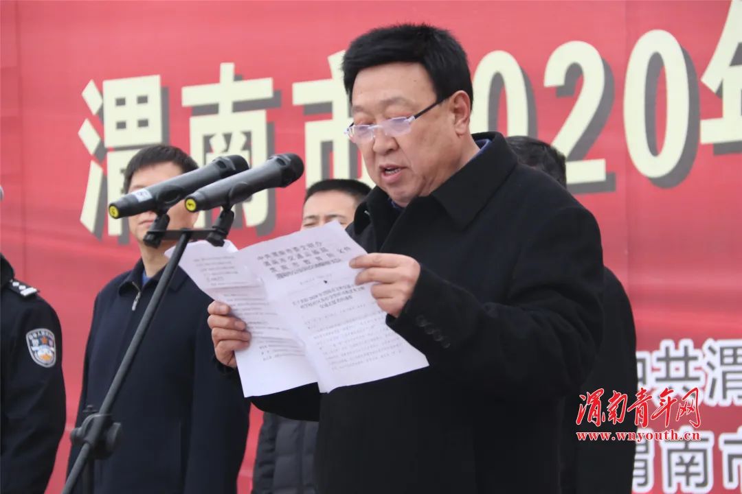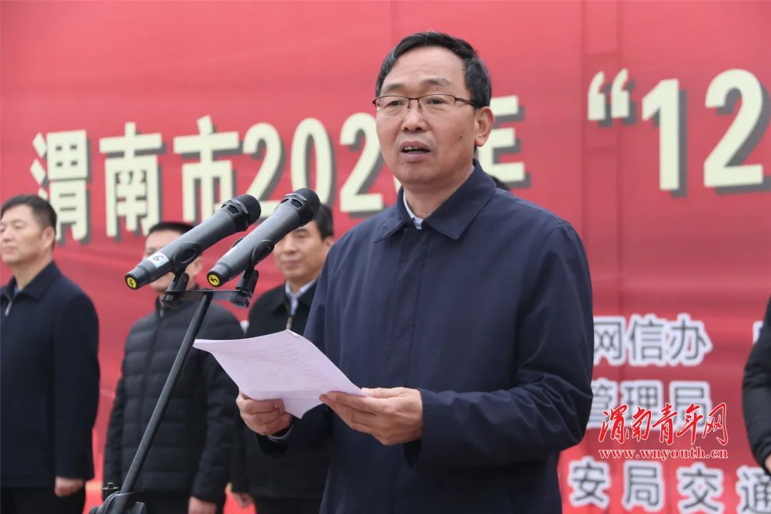 李宏才宣读了中共渭南市委文明办、渭南市交通运输局、渭南市教育局、渭南市公安局交通警察支队《关于表彰2020年渭南市文明交通示范单位、村、学校、社区及好交警好司机优秀文明交通志愿者的通报》,号召动员全社会高度重视交通安全,大力倡导“知危险会避险、安全文明出行”。