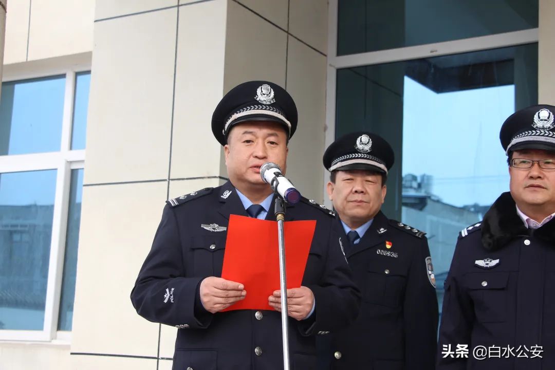 县公安局党委委员、交通管理大队大队长张旭宏宣读交通管理中队职责县政府副县长、公安局党委书记、局长陈永锋代表县政府和县公安局党委,向“两警合一”改革工作的落地见效表示祝贺。他强调,白水县公安局始终把派出所工作放在公安工作大局中谋划部署,不断推动加强派出所基础工作和队伍建设,派出所综合战斗力得到了明显提升。今年,新一届公安局党委班子审时度势,深入研究,率先在全市启动“两警合一”警务改革工作,并确定北塬、尧禾、史官三个派出所为试点单位,将交警部分职能下放派出所,一体推进“交通管理、治安维护、服务群众”勤务模式。运行以来,共联防巡逻17次,查处交通违法行为423起,纠违512起,处理轻微交通事故3起,排查道路隐患20处,化解纠纷30余起,3个乡镇无一起亡人事故发生,社会反响良好。同时,在全市公安改革项目展评会上,该改革成果也受到了市局领导、兄弟县市的充分肯定。他要求,全局上下要以此次揭牌仪式为契机,坚定贯彻执行党的群众路线,大力深化“放管服”改革,真正将车驾管业务整合、交通安全宣传、“一盔一带”守护行动深入民心,努力实现基础牢、出事少、治安好、党和人民满意的工作目标,切实提升公安派出所维护一方稳定、保卫一方平安的能力和水平。