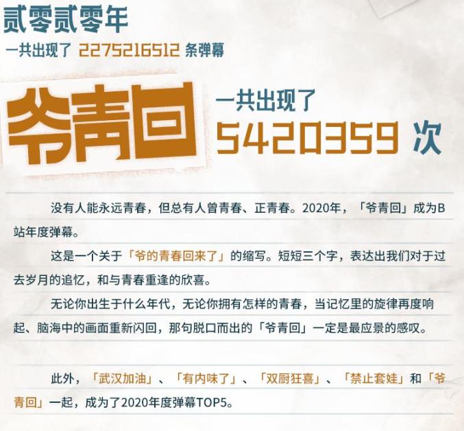 12月1日,哔哩哔哩发布2020年度弹幕:“爷青回”。