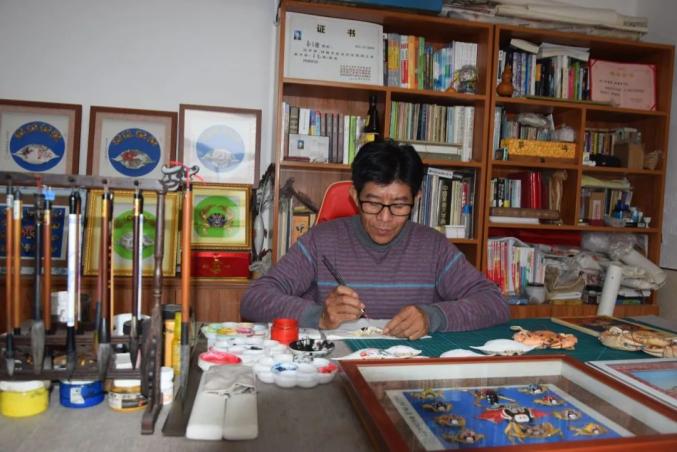 初中毕业后,和大多数渔家子弟一样,他上船出海。两年后,杜宝槐参军入伍,成了南海舰队的一名海军。因为能书会画,刚到部队,他就被挑选出来做了文书。部队的大平台为杜宝槐提供了学艺的便利条件。“那时候,时间充裕,接触的专业人员也多,我就抓住机会向人家学习。”杜宝槐说,在部队的13年时间里,他的绘画技艺有了长足的进步,也为日后创作蟹壳画打下了基础。