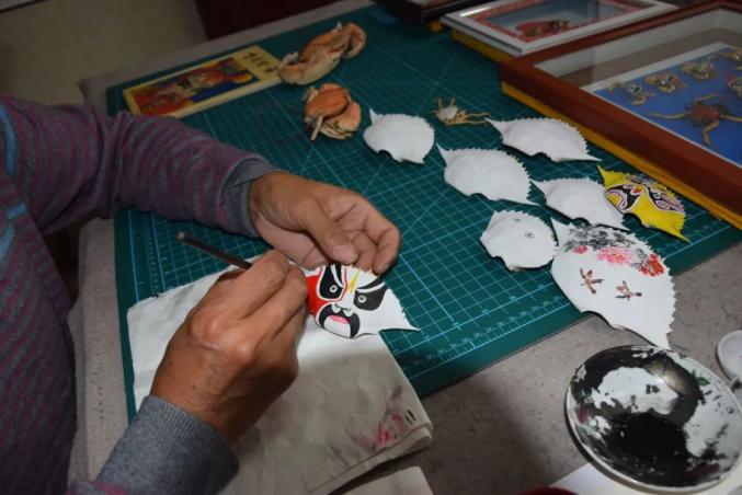 那时,闲来无事的杜宝槐经常去附近海边打渔。一次,一网下去,鱼没打着,倒是挂了一网小螃蟹上来。“要是把这些小螃蟹画成脸谱,不就是咱海堡特有的工艺品吗?”杜宝槐说,那时候旅游业刚刚兴起,各地都有旅游纪念品,来海堡游玩的人也渐渐多了起来,他琢磨着是不是可以造出一种海堡特有的纪念品?