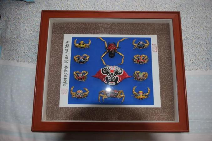 “来了咱海堡,除了买海鲜,是不是还可以有工艺品,留下对海堡的记忆。”杜宝槐说。于是,他把这些小螃蟹拿回家,清洗、晾干,整整有一箱。这一箱小螃蟹,他足足画了一个冬天。“全部画的京剧脸谱,画好后,我又自己琢磨着把他们装裱好。”就这样,杜宝槐创作的第一批蟹壳画出炉了。