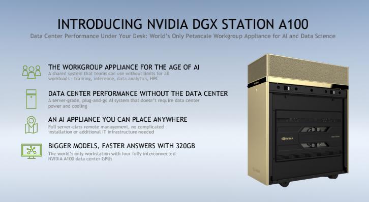 这一背景下,NVIDIA于11月推出的工作组服务器NVIDIA DGX Station A100在满足各领域AI及大数据应用对算力、内存需求的同时,将AI基础设施部署及应用的门槛降低。