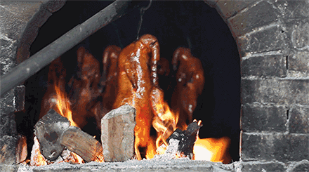 最出名是北京烤鸭。填鸭炉火里走一遭,肥硕,身子溜圆,滋滋冒油,亮枣红色,看得人两眼发直。
