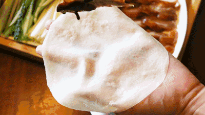 片薄片码盘,一张荷叶饼,卷三两片鸭肉,几根葱丝、黄瓜条,点些甜面酱,味道丰富得很。