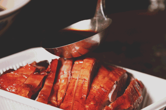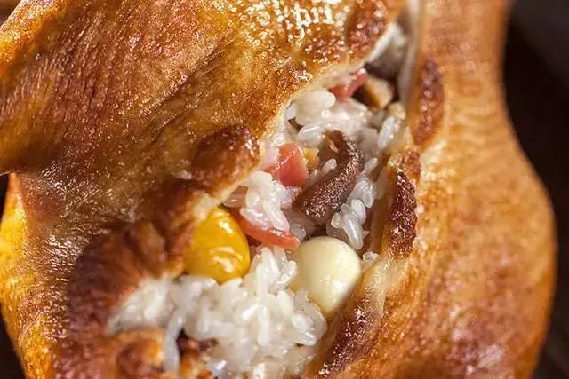 剖开鸭腹,肚内填冬菇、冬笋、火腿丁、虾仁、青豆,加绍兴酒、酱油、白糖一众配料,扣碗笼里,蒸煮数小时,出笼再浇上调制好的卤。这叫八宝鸭。