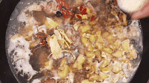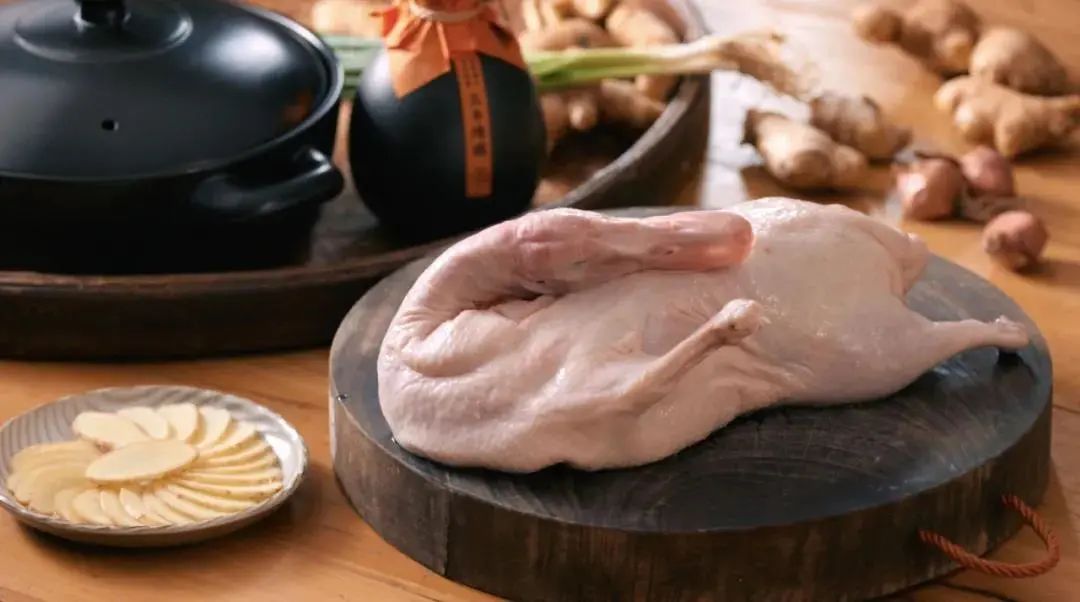 番鸭排尽血水,除净细毛。半干的老姜片铺在锅底。煸干、晒干皆可,锅需是砂锅。整鸭入锅是正统的做法,加白酒增香,麻油、酱油、蚝油调味,再有几味中药材。