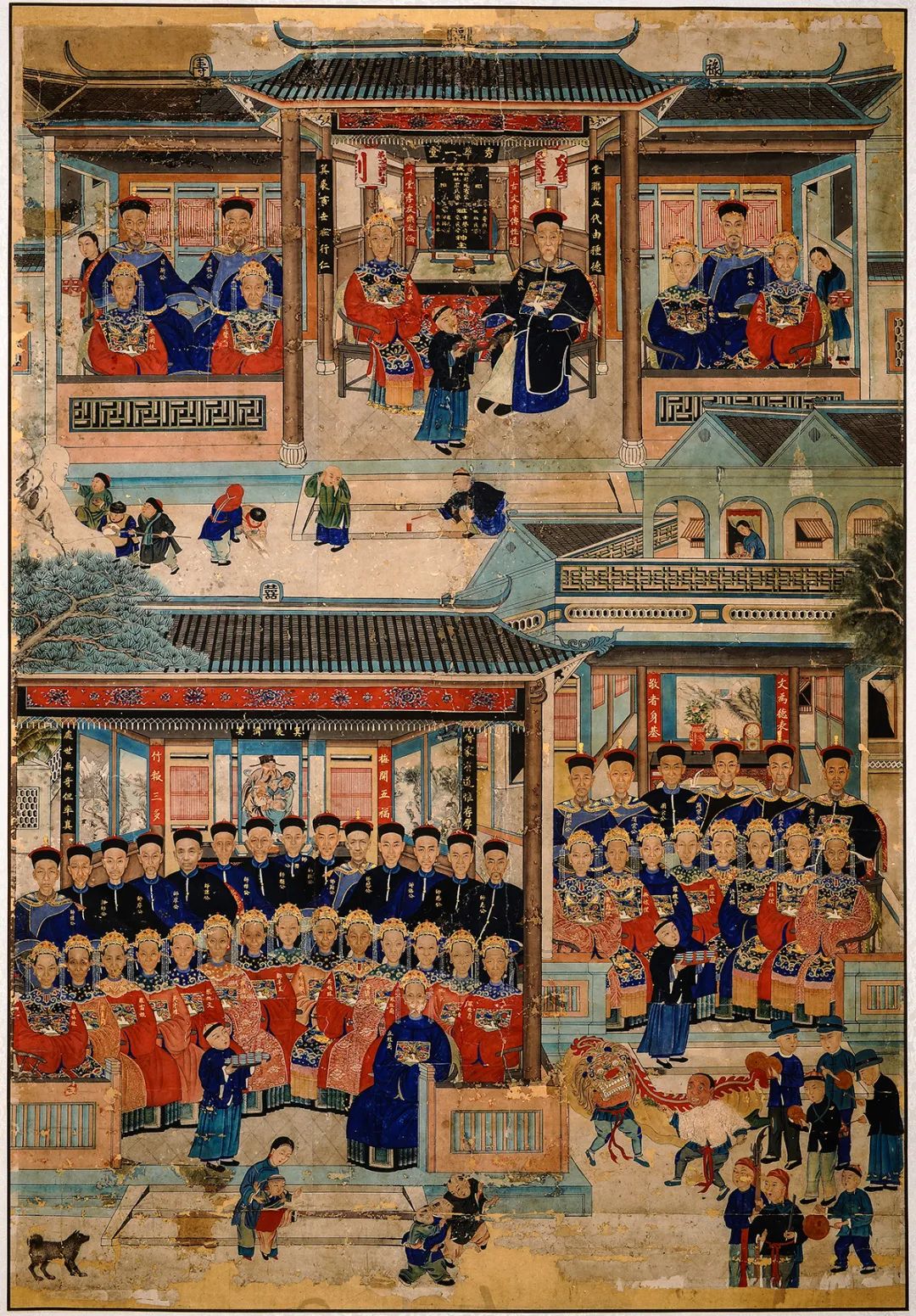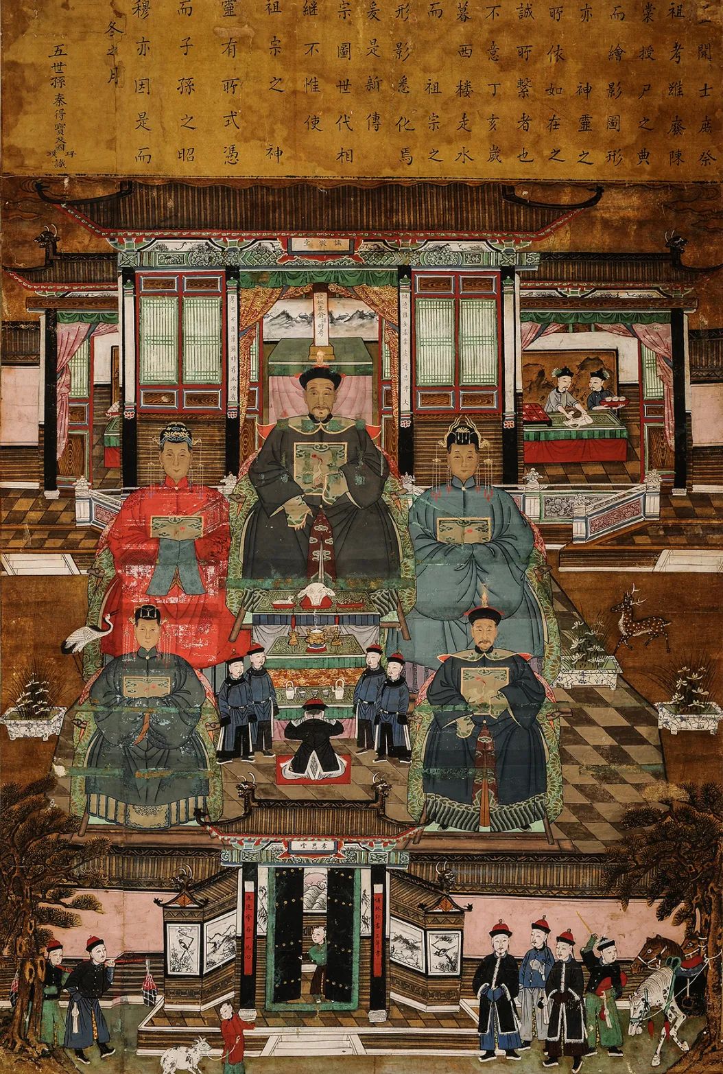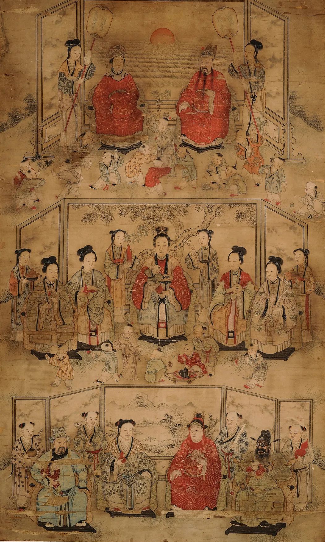 在中国早期绘画里,人物画因其特殊的叙事性所赋予的教化功能,使其在绘画史中占有重要地位。宋元以降,文人画兴起并大行其道,山水画、花鸟画成为主流,人物画逐渐被边缘化。明清时期,人物画在绘画史的地位固然不再显赫,但随着士人阶层的壮大,家族生活与信仰之形象化表达需求的增长,表现昭穆有序的祖宗画、内外和谐的行乐图、人神共享的吉庆画,以其“成教化、助人伦”“修身、齐家”的社会功能,延伸和普及到中国传统社会的每一个角落。