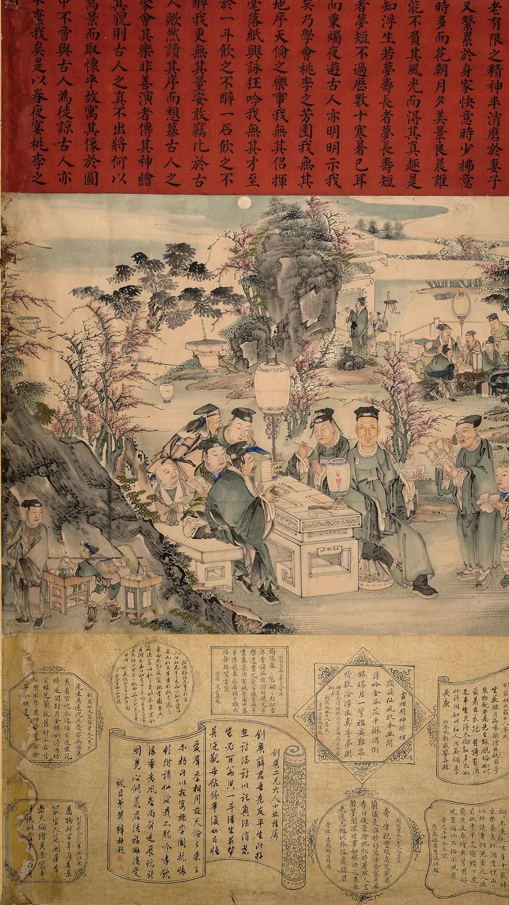 行乐图通常是将日常娱乐与休闲生活仪式化地“定格”。这一南北朝时期就出现的绘画主题,暗含四海无虞、社会安定与生活富足的创作背景与祈望,在明清时期十分流行。雅集是文人间凝聚情感、交流学术、传播思想的一种聚会形式,雅集图可说是更大规模的行乐图。