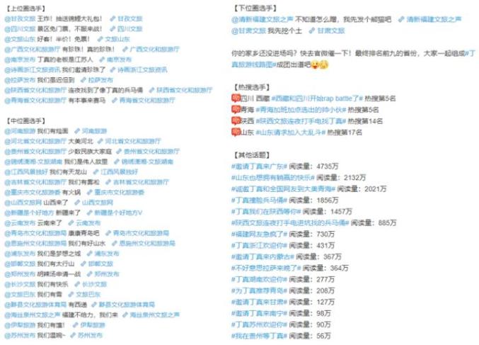 @西藏日报 率先“将错就错”借当事人想去拉萨为由发博邀请丁真来西藏,随后各地也“按捺不住”纷纷主动邀约,借此以视频、图片或文字的形式大秀本地美景。其中@陕西省文化和旅游厅 以“长得和丁真真像的兵马俑”;@湖北日报 以“丁真同款耳坠”等形式创意借势,引流效应突出。而四川本地官博@四川文旅 等也并未坐以待毙,积极参与到抢人的环节之中,与各地官博积极互动,由此诞生“川藏CP”,让热度再次回归本地。