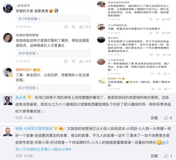 11月27日 #丁真最想去的地方是拉萨#(阅读2.5亿 讨论4.6万)源自丁真接受四川媒体@四川观察 的一次电视采访。一句“最想去拉萨”,使得网友一时间分不清丁真到底是在四川还是在西藏。一场阴差阳错,微博上媒体、文旅账号掀起了一场宣传自己家乡旅游,#邀请丁真来我家乡#的大型互动,一时间全网网友都变成评论里“哈哈哈哈”的吃瓜群众。