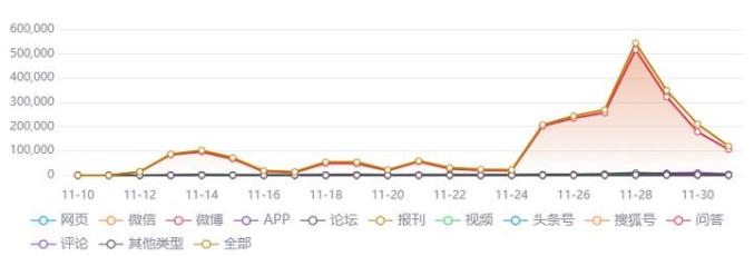 11月12日至11月30日,共监测到“丁真”舆情信息252万余条。自短视频播出的11月12日起,全网有关丁真的舆情一直呈现出波动上升趋势,并分别于14至15日、25日、27至28日形成三段高峰。