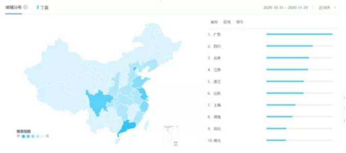 从省份来看,搜索“丁真”的除了排名第二的四川是本土省份,以广东、北京、江苏、浙江、山东、上海等东部发达地区为主,然后是中部的河南、河北、湖北等省,未来可以预见到丁真带来的线下变现也会以这些地区为主。